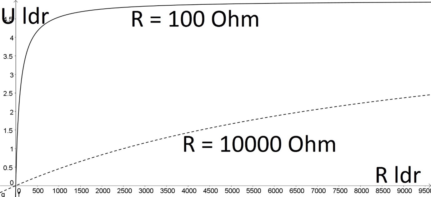 Als het lichter is wordt de weerstandswaarde van de LDR kleiner waardoor er minder spanning over de LDR staat, maar meer over de Ohmse weerstand. De spanning over de LDR (ULDR = 5,0 x RLDR / (RLDR + RΩ)) kan je meten met behulp van de ANALOG IN van de Arduino. De spanning is dan een maat voor de gemeten lichtintensiteit. Je kan nu ook kiezen welke Ohmse weerstand je wilt hebben. Dat ligt er aan voor welk gebied je sensor gevoelig moet zijn. Zie de tweede grafiek.