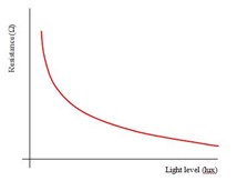 Voor een lichtsensor hebben we een LDR nodig, zie de foto. LDR staat voor Light Dependent Resistor (licht afhankelijke weerstand). De weerstandswaarde verandert met veranderende lichtintensiteit, zie de grafiek.