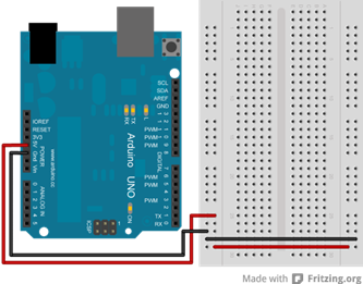 Het breadboard heeft een plus en een min kolom, deze moet je aansluiten met de Arduino. De + kant sluit je aan op de 5V uitgang of op een uitvoerpoort van de Arduino. De – kant sluit je aan op de GND (ground) van de Arduino.