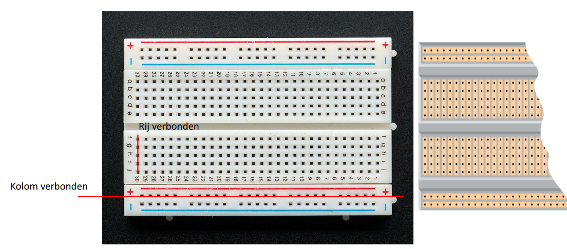 Het breadboard heeft rijen en kolommen, zie hiernaast en hieronder voor een opengewerkte breadboard. De punten in een rij zijn met elkaar verbonden. Maar laten we hier niet te lang bij stil staan… we gaan aan de slag!