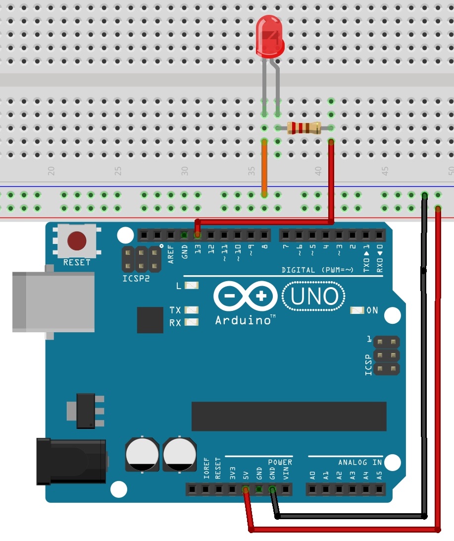 Nu kan je je led wel laten branden, maar daar heb je nog niet veel aan… Een volgende stap is de LED aansturen met behulp van een stukje code. Om de LED aan te sturen met behulp van code moet je de uitvoerpoort van de Arduino verbinden met je LED. De 5V output heb je niet nodig, de uitvoerpoort van deArduino levert nu 5V.