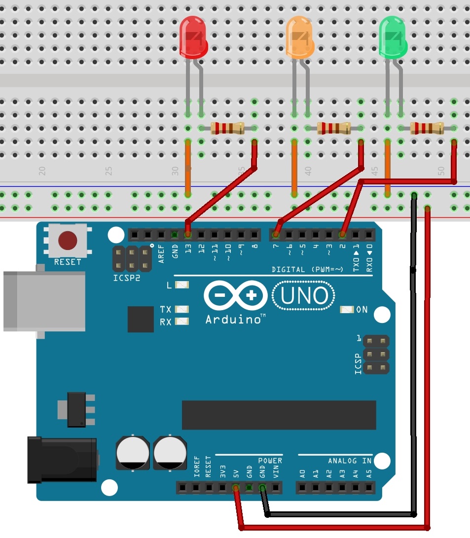 h) Verander het script en maak een verkeerslicht waarbij oranje maar even aan staat.