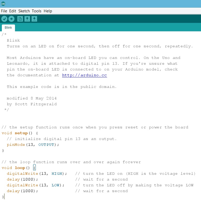 Bovenaan het programma Blink staat /* dit betekent dat alles na dit begin tekenen voor het afsluitteken */ commentaar is. Hier zet je neer hoe het programma heet, wat het doet, wie het gemaakt heeft en wanneer je het voor het laatst veranderd hebt.